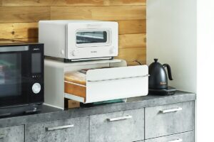 引き出し式のブレッドケースとキッチンラックが一緒になった「UtaU ブレッドドロワー」。天板にトースターやケトルなどのキッチン家電が置ける丈夫なスチール製で、滑らかに開閉できる引き出しとインテリアになじむデザインが魅力です。引き出しには食パンやコーヒー、調味料など、台所でよく使うものをたっぷり収納。引き出し下はラップやトレーなどの小物収納に便利。ステンレス製の取っ手には布巾を掛けても◎。設置場所やお好みに合わせて、全4サイズからお選びいただけます。