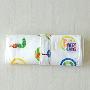 表面ははらぺこあおむしがとっても鮮やかなカラーでプリントされたダブルガーゼ生地、裏面はシンカーパイルになっていて、リバーシブルでご使用いただけるおむつ替えシートです。裏側にはラミネート加工が施されていて、水分を通しません。小さく折りたたんでカバンに入れての持ち運びにもかさばりません。